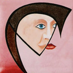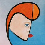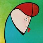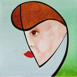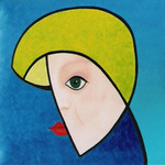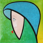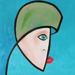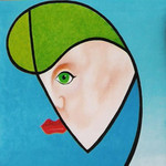 2004Op rubberdoek geschilderd,met olieverf en fluoricerend pigment.De achtergrond is een overgang van één kleur naar een volgende. Het gezicht geeft weer waar ik mijn inspiratie haal.
