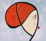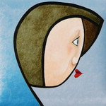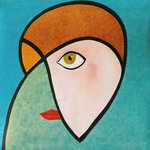 2004Op rubberdoek geschilderd,met olieverf en fluoricerend pigment.De achtergrond is een menging van twee kleuren. Het gezicht geeft weer waar ik mijn inspiratie haal.